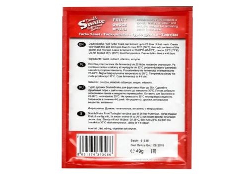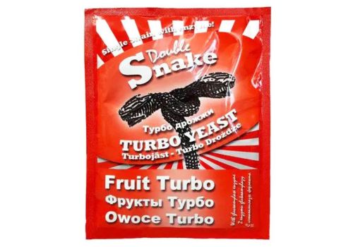 Турбо-дрожжи Double Snake Fruit для дистиллята способные дать до 17% крепости фруктового сусла, с минимальным количеством сивушных масел. Дрожжи рассчитаны на 25 литров затора в соотношении от 6-7кг сахара или декстрозы. Время сбраживания составляет примерно от 2 до 5 дней крепостью 14% - 17%. Если добавить 7 кг сахара или декстрозы на 25 литров воды, то сусло бродит примерно до 5 дней, но крепость составит примерно 17%.