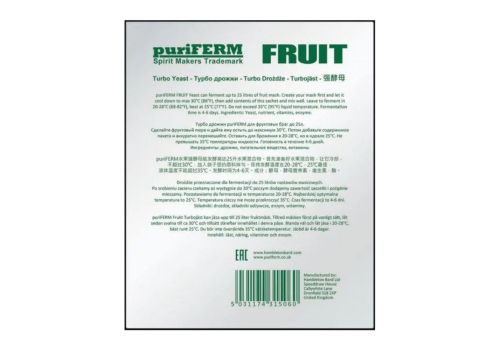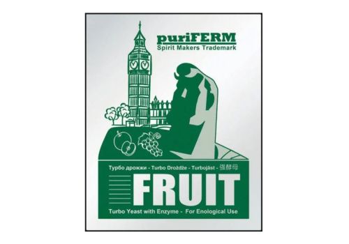 Puriferm Fruit - специальный штамм турбо дрожжей для фруктовых заквасок, разработанный в качестве профессиональных дрожжей для дистилляции и предназначенный для приготовления дистиллятов из фруктового и плодово-ягодного сырья. С помощью этих дрожжей вы получите дистиллят с превосходными свойствами, вкусом и запахом.