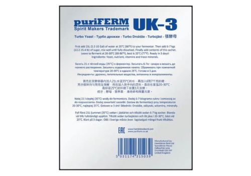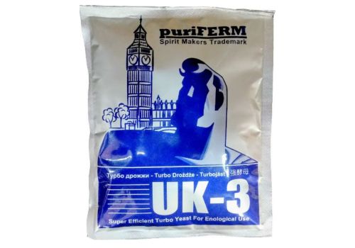 Puriferm Turbo UK-3 - является продуктом английской компании Hambleton Bard. Пакет содержит специальную культуру дрожжей, витамины и микроэлементы, которые позволяют быстро сбродить 6-7 кг сахара в течение трех дней.