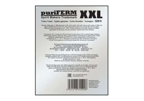 Puriferm XXL 100L - дрожжи для профессионалов. Эти турбо дрожжи предназначены для сбраживания 100 литров сахарного сусла. Данный штамм дрожжей имеет высокую толерантность к высоким температурам, благодаря чему возможно сбраживание большого объема, без дополнительного охлаждения.