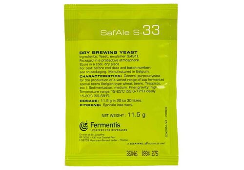 Fermentis S-33 - Дрожжи верхового брожения с нейтральным ароматическим профилем. Общепризнанный  многофункциональный  штамм,  отличающийся  устойчивостью  в хранении и стабильностью результата. Этот штамм позволяет получить изумительные ароматические профили,  а  также идеален  для производства  специальных  сортов  пива (бельгийский сорт пшеничного пива, траппист и тд).